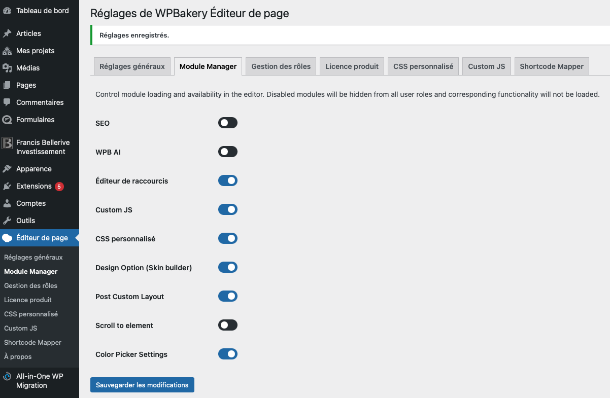 - Installer et activer les extensions Impreza (UpSolutionCore, WPBakery Page Builder, FileBirdPro, Custom Post Type UI, Duplicate Page, Converter for Media). Si certaines extensions ne veulent pas s’installer, s’assurer que le thème et que UpSolution core soit à jour.