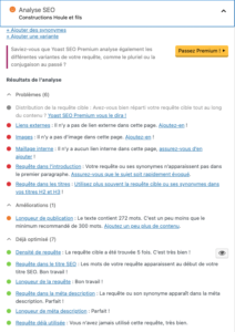 Dans cet onglet de l’encadré, Yoast a analysé votre contenu et a soulevé des problèmes tout comme des améliorations ainsi que des aspects déjà optimisés. Vous pouvez tenter de rendre votre score SEO vert en réglant les problèmes en rouge et les améliorations en orange.