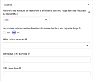 Parfois, il se peut que des pages soient créées dans WordPress uniquement dans le but de construire un permalien logique (ex : création d’une page parente « Services » pour que le permalien des services ressemble à « …/services/nom-du-service »). Dans ce cas, comme la page sera souvent vide, nous ne voudrons pas qu’elle soit répertoriée dans les moteurs de recherche. Nous voudrons donc désactiver l’indexation de cette page uniquement.