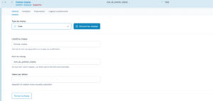 Étape 3 : Créer les champs individuels. Maintenant, vous êtes à l’étape de création des champs qui devront être remplis dans chacun des « posts » ou fiches d’un Custom Post Type (c’est normalement de cette manière qu’on l’utilise, bien que le plugin soit très versatile et approprié pour de nombreux autres usages). Il s’agit donc de nommer le libellé du champ (en appuyant sur TAB après l’avoir écrit, le nom du champ se remplira automatiquement en dessous) et de sélectionner son type. Les plus couramment utilisés sont Texte, Zone de texte, Éditeur WYSIWYG, Image et Lien. Chaque type a ses propres paramètres, à vous de choisir lesquels appliquer. Après avoir sélectionné le type de champ, vous pouvez naviguer dans les onglets pour ajouter une valeur par défaut ou un placeholder, pour rendre le champ obligatoire, ou pour ajouter des conditions logiques, entres autres.