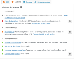 Cet onglet soulève les problèmes à corriger pour avoir un meilleur score SEO. À noter qu’il est plutôt difficile d’avoir un score vert, car Yoast a des critères sévères. Les problèmes qu’il relèvera sont parfois incorrigeables en raison de la structure de la page (ex : une page Contact qui ne contient pratiquement pas de texte) ou du contenu fourni par le client. Nous ferons toutefois notre possible pour régler les problèmes et les améliorations. Certains critères seront pourtant remplis (ex.: la page contient des images, mais Yoast ne les détecte pas), donc ne pas trop s’attarder à ceux-ci.