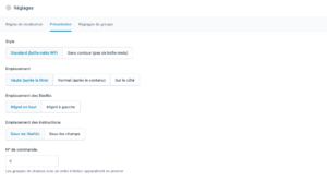 Étape 5 : Changer l’emplacement de l’affichage du groupe de champs. Pour que le groupe de champs soit plus repérable dans la fiche du « post », nous changeons habituellement son emplacement pour le placer en haut de la page. De cette façon, le groupe de champs est la première chose que l’on voit une fois le « post » créé. Pour changer l’emplacement, il suffit de modifier le paramètre « Emplacement » dans l’onglet « Présentation » de la section « Réglages » de la page d’édition du groupe de champs.