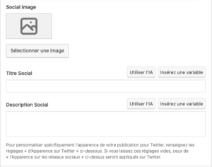 Dans cet onglet, vous pouvez fournir une image, un titre ainsi qu’une description, qui seront affichées lorsque la page sera partagée sur les réseaux sociaux comme Facebook, Twitter, Instagram, WhatsApp, Threads, LinkedIn, Slack et plus encore. Dans la version gratuite de Yoast SEO, vous devrez ajuster cette section dans chacune des pages si vous désirez une image, un titre et une description personnalisés.
