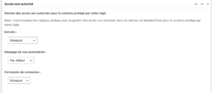 - Dans l’encadré “Accès non autorisé”, mettre les extraits masqués, le message de non autorisation par défaut et le formulaire de connexion masqué. ***