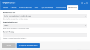 - Dans la page où on doit cacher une rangée, cliquer sur le crayon de la rangée et aller dans l’onglet MemberPress (ne fonctionne pas avec les rangées internes et les blocs). Choisir la règle à appliquer et sauvegarder les modifications.
