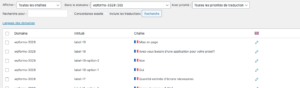 - Dans le submenu “Dans le domaine”, il est possible de sélectionner le form selon son ID. Par exemple, si le ID du forms est 5050, sélectionner le domaine wpforms-5050 pour voir les champs à traduire.