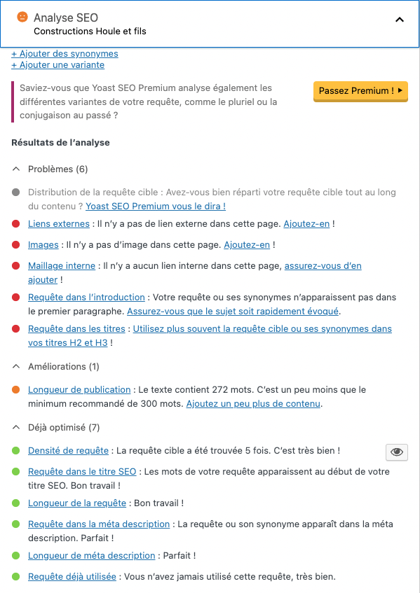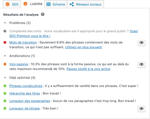 Dans cet onglet de l’encadré, Yoast a analysé votre contenu et a soulevé des problèmes tout comme des améliorations ainsi que des aspects déjà optimisés. Vous pouvez tenter de rendre votre score SEO vert en réglant les problèmes en rouge et les améliorations en orange.