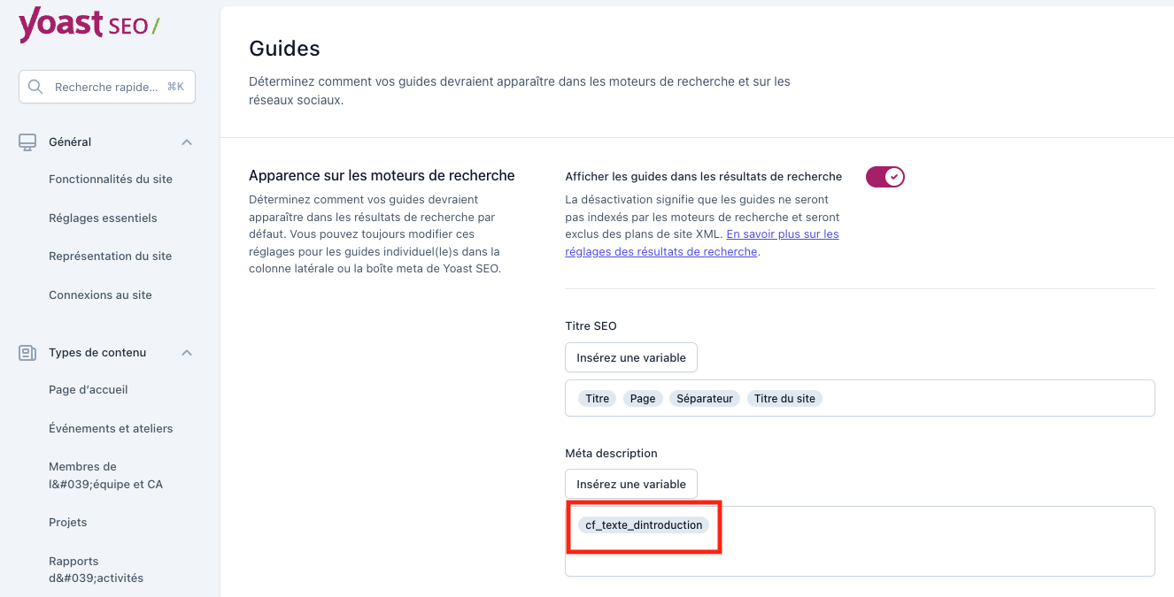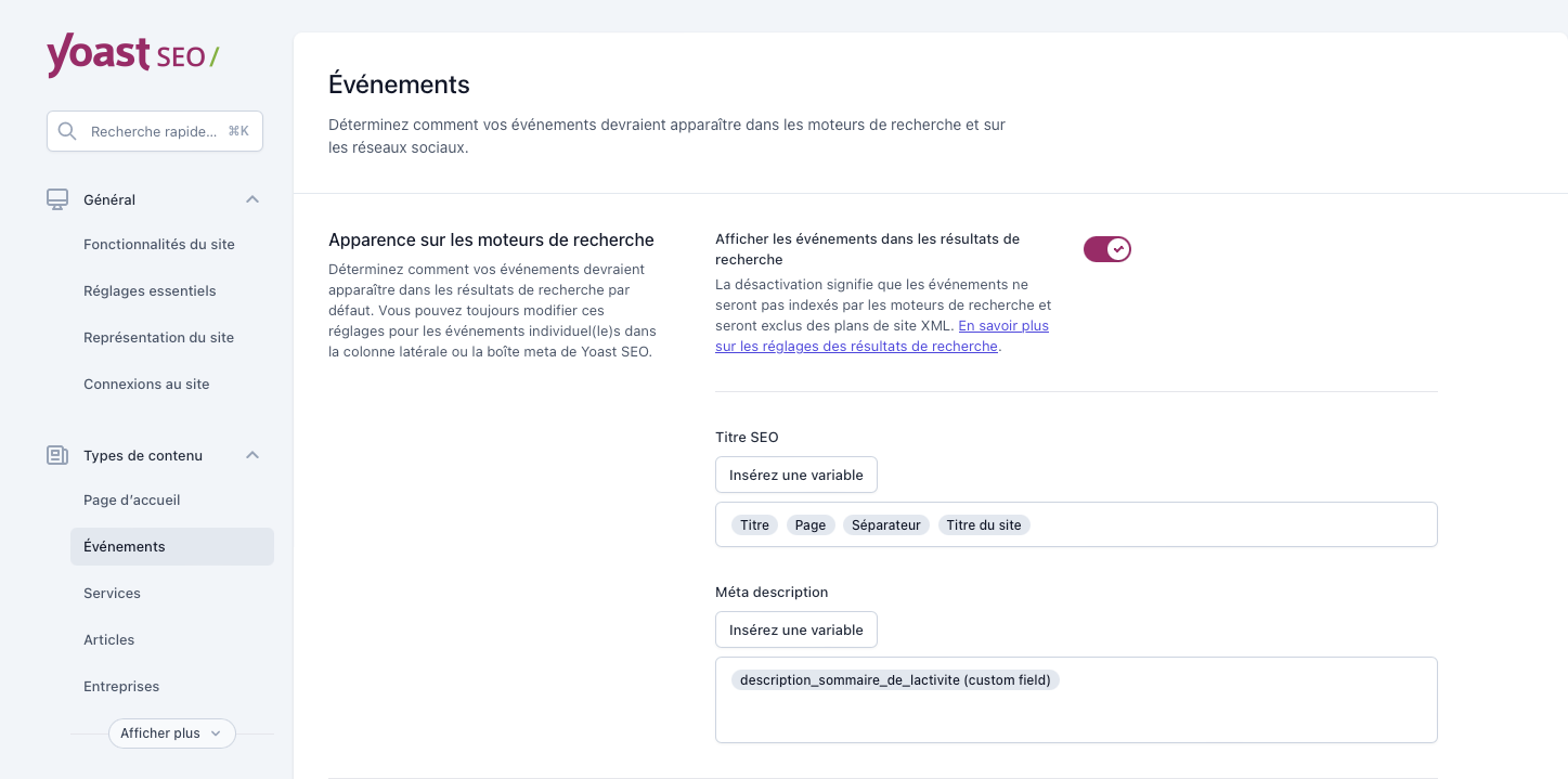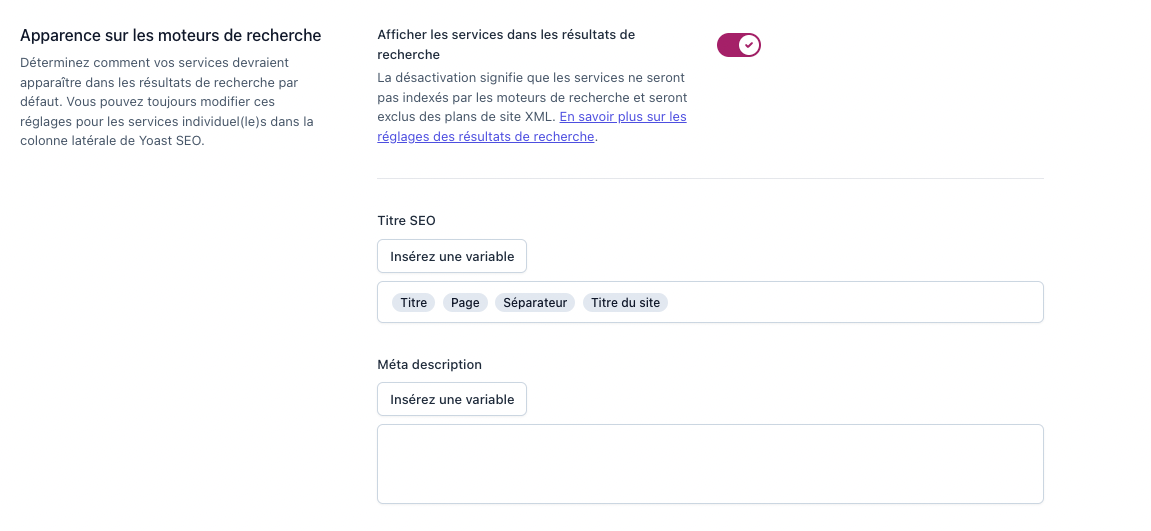Sous cet accordéon, vous trouverez notamment vos Custom Post Types ainsi que d’autres types de blocs du thème (Blocs réutilisables, Entêtes, Grilles, etc.) La question que vous devez vous poser est la suivante : Quelles pages doivent apparaître dans Google?Normalement, vous désactiverez le réglage « Afficher dans les résultats de recherche » pour les blocs réutilisables, les entêtes, les grilles et les modèles de page (voir la capture d’écran). Vous laisserez toutefois le réglage activé pour les Customs post types qui ont des fiches individuelles, les Articles et les Pages. Dans ce cas-ci, vous pouvez décider la structure du Titre SEO (la façon dont le titre apparaîtra dans les moteurs de recherche) avec des variables ou en écrivant du texte directement dans le champ, mais aussi la structure de la métadescription.Si vous voulez que toutes les pages associées au type de publication en question aient la même description dans les moteurs de recherche, vous pouvez en rédiger une ici.Pour une métadescription unique à chacune, vous devrez vous rendre dans chaque page, sous le Page builder, dans l’encadré Yoast SEO.Si vous descendez un peu plus dans la page, vous verrez une section intitulée « Schéma ». Choisissez ici le type de page ou le type d’article qui se prête le mieux à vos publications. Cette option est personnalisable dans chacune des pages dans l’onglet « Schema » de l’encadré Yoast (sous le Page buidler) si jamais une d’entre elle fait exception à la règle.