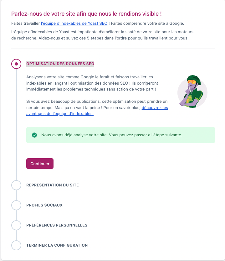 Suivez les étapes qui vous sont proposées (Optimisation des données SEO, Représentation du site, Profils sociaux, Préférences personnelles et Terminer la configuration).