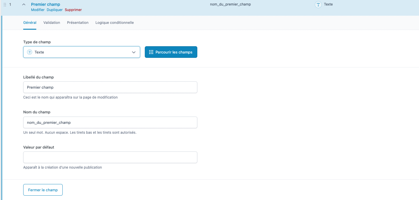 Étape 3 : Créer les champs individuels. Maintenant, vous êtes à l’étape de création des champs qui devront être remplis dans chacun des « posts » ou fiches d’un Custom Post Type (c’est normalement de cette manière qu’on l’utilise, bien que le plugin soit très versatile et approprié pour de nombreux autres usages). Il s’agit donc de nommer le libellé du champ (en appuyant sur TAB après l’avoir écrit, le nom du champ se remplira automatiquement en dessous) et de sélectionner son type. Les plus couramment utilisés sont Texte, Zone de texte, Éditeur WYSIWYG, Image et Lien. Chaque type a ses propres paramètres, à vous de choisir lesquels appliquer. Après avoir sélectionné le type de champ, vous pouvez naviguer dans les onglets pour ajouter une valeur par défaut ou un placeholder, pour rendre le champ obligatoire, ou pour ajouter des conditions logiques, entres autres.
