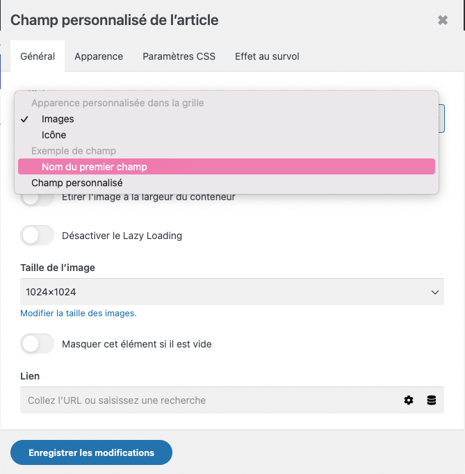 - Dans le menu déroulant, sélectionner le champ ACF qui correspond à la gallery.