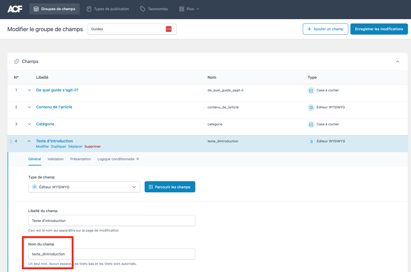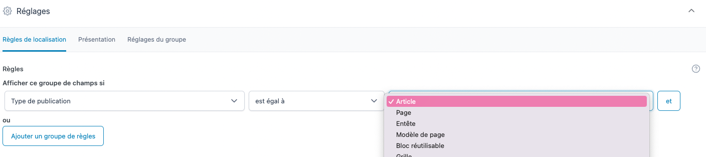 Étape 5 : Changer l’emplacement de l’affichage du groupe de champs. Pour que le groupe de champs soit plus repérable dans la fiche du « post », nous changeons habituellement son emplacement pour le placer en haut de la page. De cette façon, le groupe de champs est la première chose que l’on voit une fois le « post » créé. Pour changer l’emplacement, il suffit de modifier le paramètre « Emplacement » dans l’onglet « Présentation » de la section « Réglages » de la page d’édition du groupe de champs.