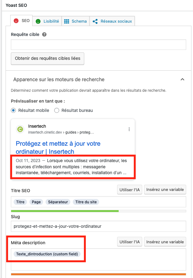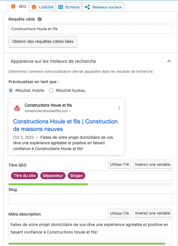 Titre SEO : Lorsque vous rédigez le titre SEO, gardez en tête le fait qu’il s’agit de la phrase qui fera en sorte que l’utilisateur sera porté à cliquer sur votre résultat de recherche ou non. Soyez clair et faites en sorte que votre titre soit attrayant. Surveillez la jauge de couleur pour vous assurer que votre titre soit assez long (sans trop l’être).