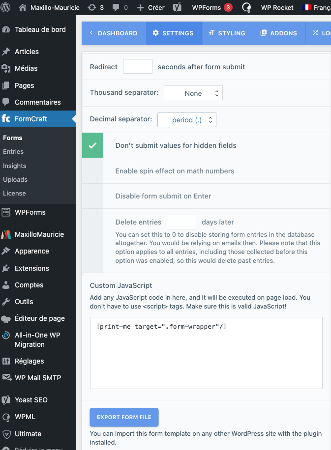 - Ajouter le shortcode de Print-o-matico où se trouve déjà le code du formulaire. Par exemple, si le code du formulaire [fc id=’10’][/fc] est dans une balise HTML personnalisée, ajouter le shortcode de Print-o-matico [print-me target=”.form-wrapper” title=”Imprimer le formulaire” printicon=”false”/] dans cette balise.