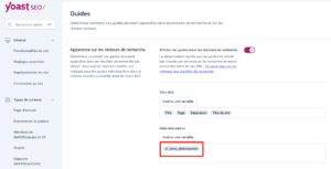 Dans le menu gauche de WordPress, sous Yoast SEO, cliquez sur « Réglages ». Puis, dans la partie de gauche que vous verrez sur la page accédée, cliquez sur les onglets dans les accordéons suivants et remplissez les champs (de la version gratuite) selon les instructions données :