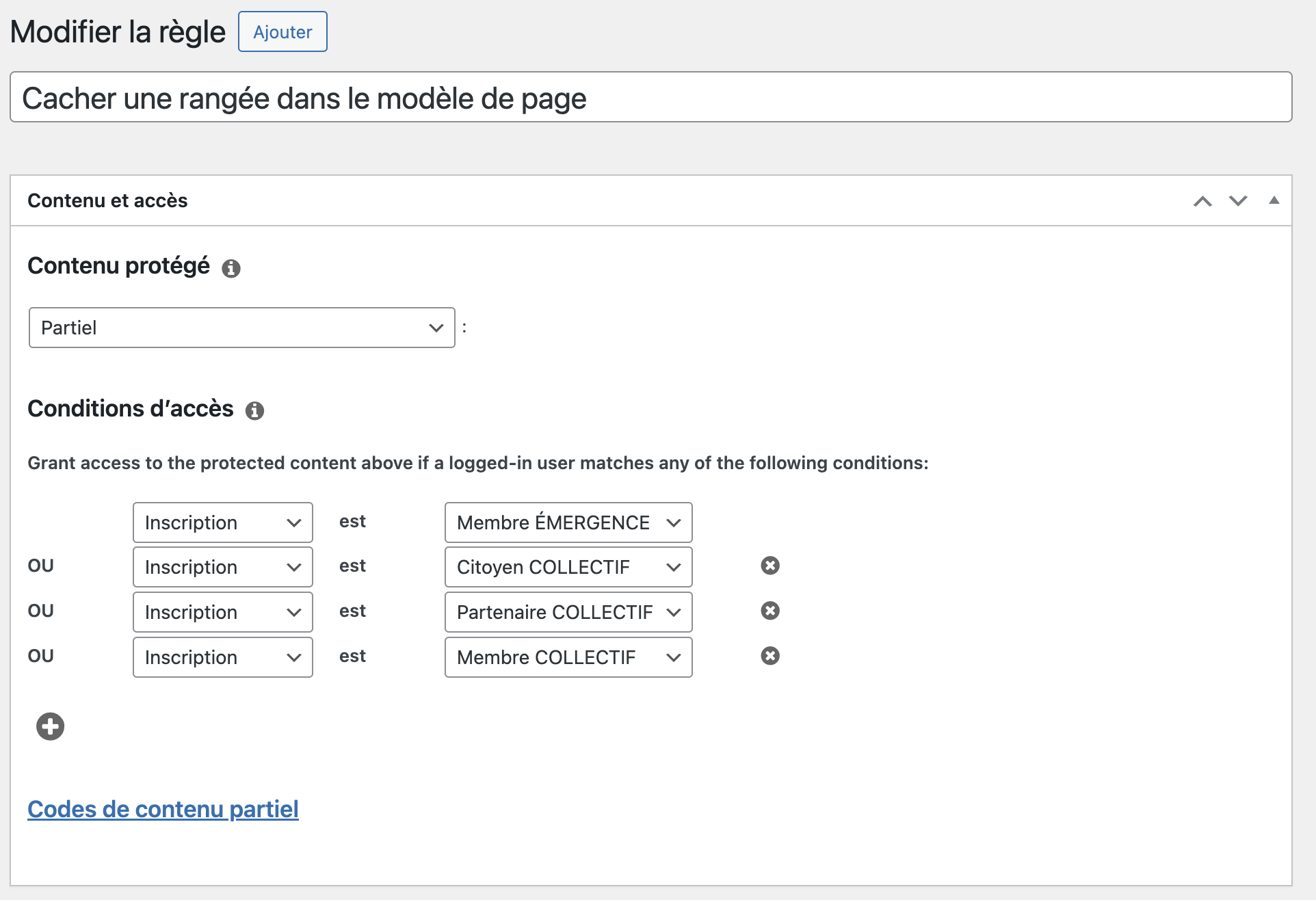 - Pour Contenu protégé, choisir “Partiel” et pour les Conditions d’accès, choisir le type d’inscription qui peut avoir accès au contenu. Cliquer sur le “+” pour rajouter des conditions.