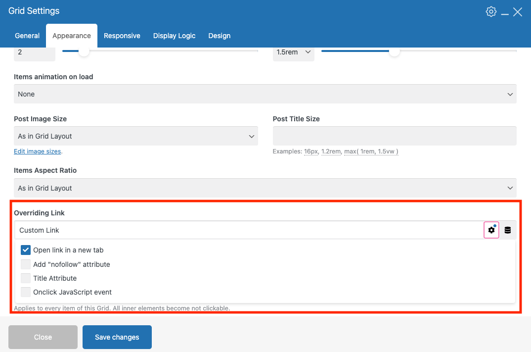 - Dans l’onglet “Apparence” de cette même fenêtre, sélectionner la source du lien (Custom Link) en cliquant sur l’icône de base de données. Ensuite, cliquer sur l’engrenage et cocher la case pour ouvrir dans une autre fenêtre (target _blank).