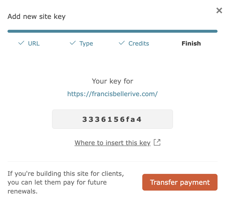 - Noter/copier la clé du client et cliquer sur X (et non sur “Transfer payment)