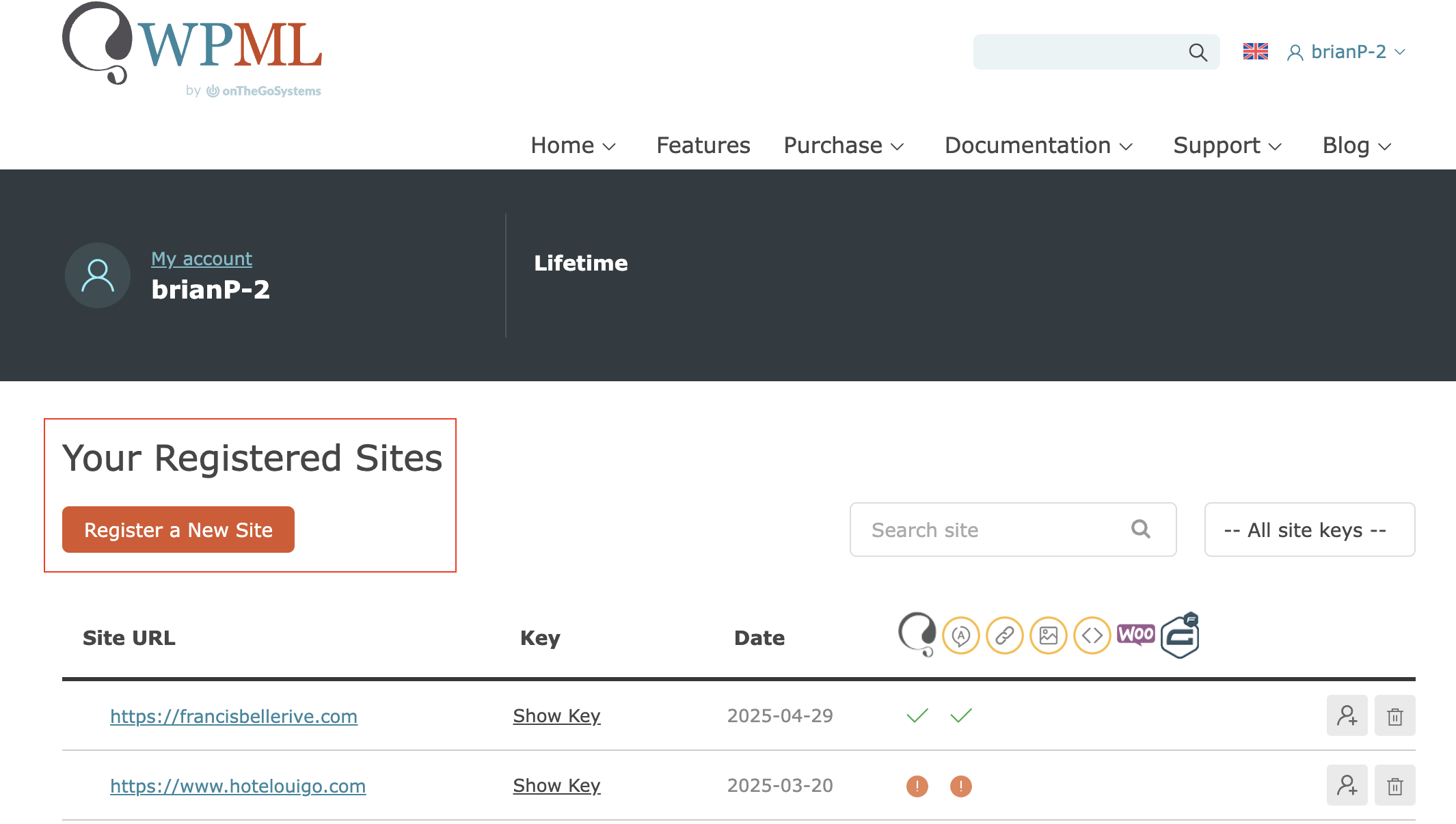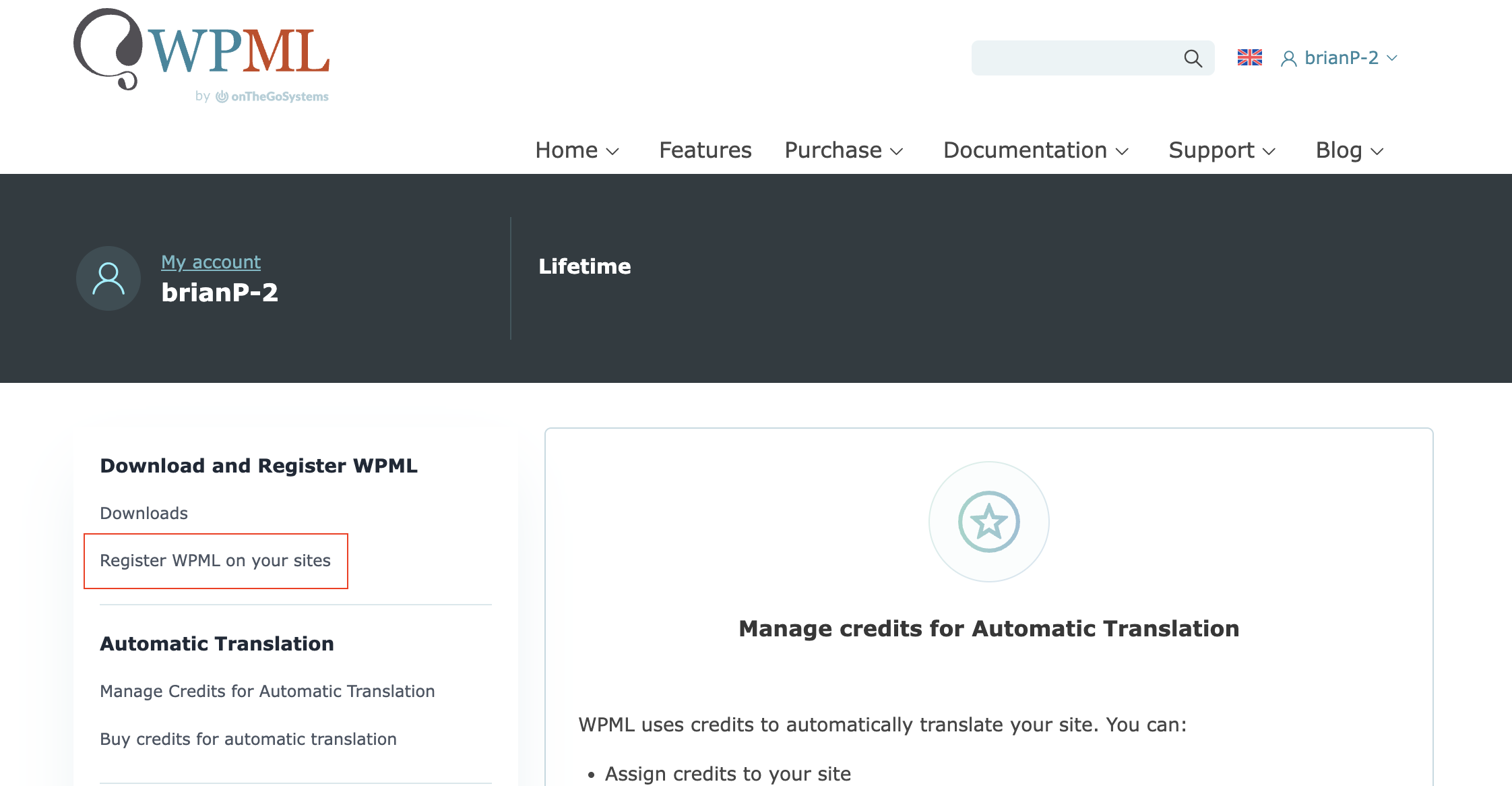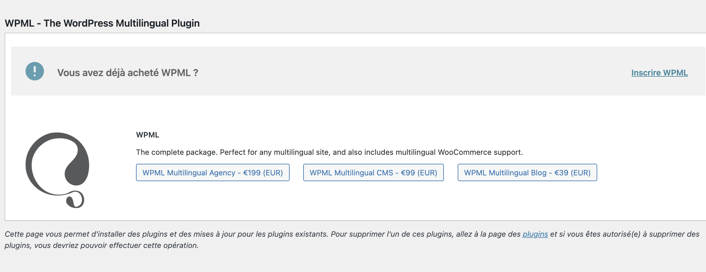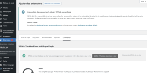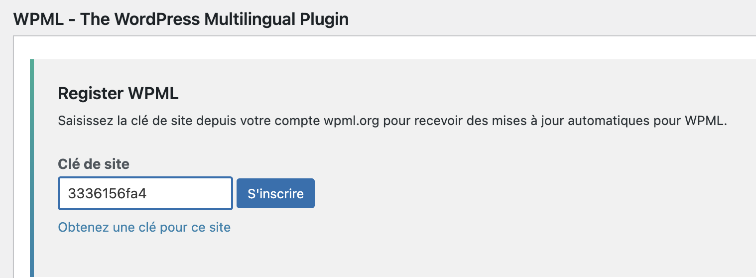 - Cliquer sur “Inscrire WPML” et ajouter la clé de site du client (copiée à l’étape 7)