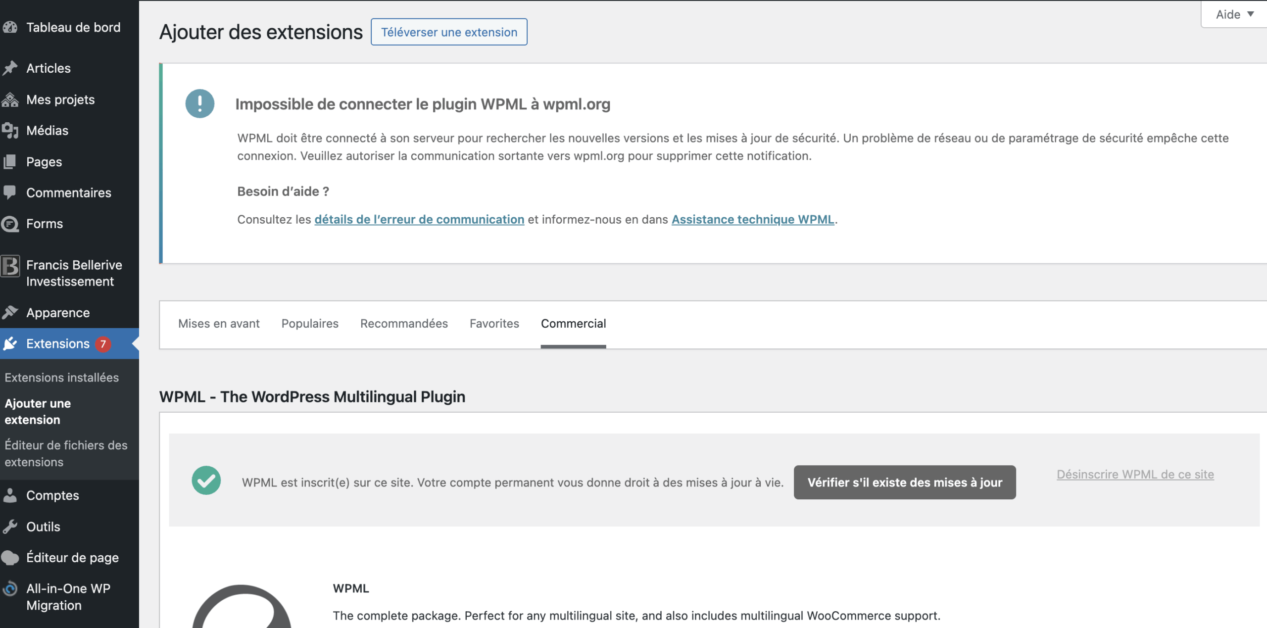 - Cliquer sur l’onglet “Commercial” et ensuite sur “Désinscrire WPML de ce site”
