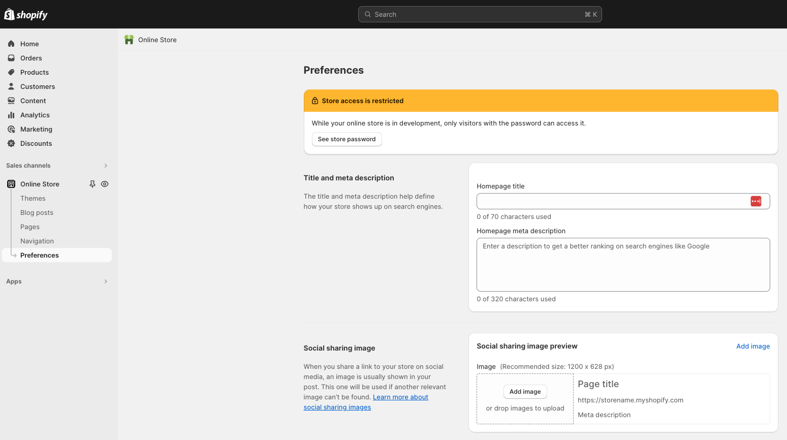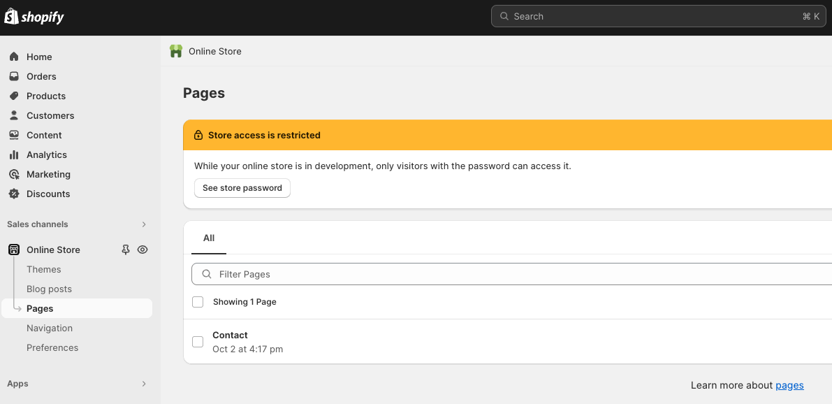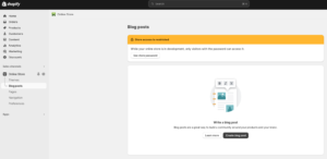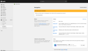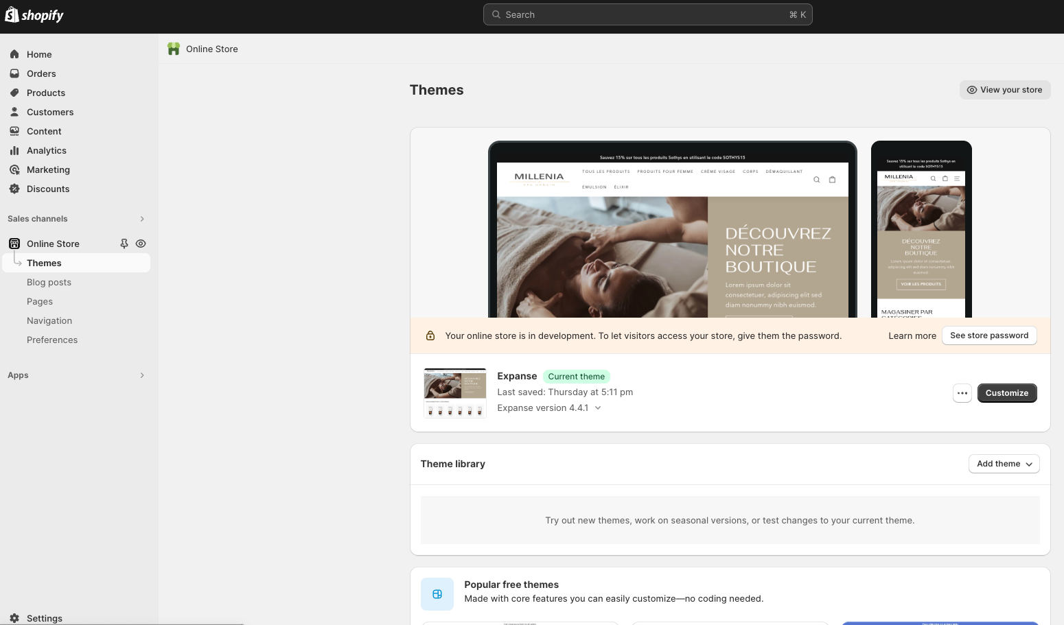 Cette interface contient le thème Shopify de base ainsi que le thème choisi pour l’entreprise. C’est ici que l’on peut cliquer sur ‘Customize’ pour créer le site du client. On peut aussi jouer dans le code backend en cliquant sur les trois petits points à côté du bouton ‘Customize’. Il est également possible de voir le site en ‘live’ en cliquant sur ‘View your store’.